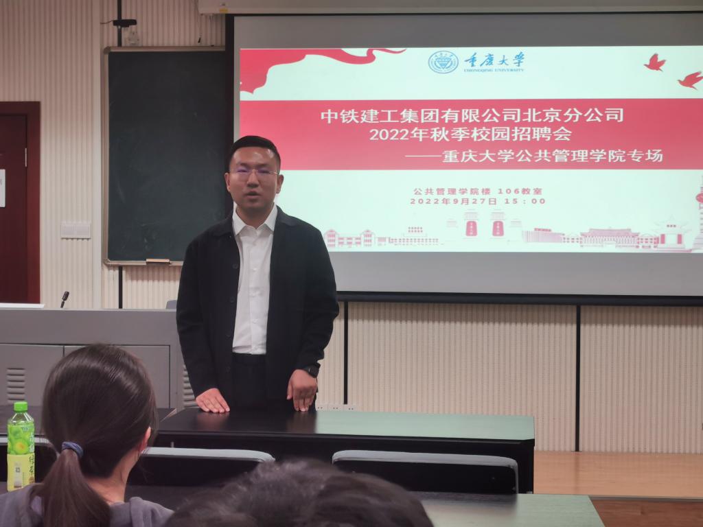 专场招聘会。本次招聘会由学办主任、19级辅导员王丽娟主持,中铁建工集团北京分公司重庆东站工会主席孙宇主讲,2019级部分同学到场聆听,并在现场投递简历。