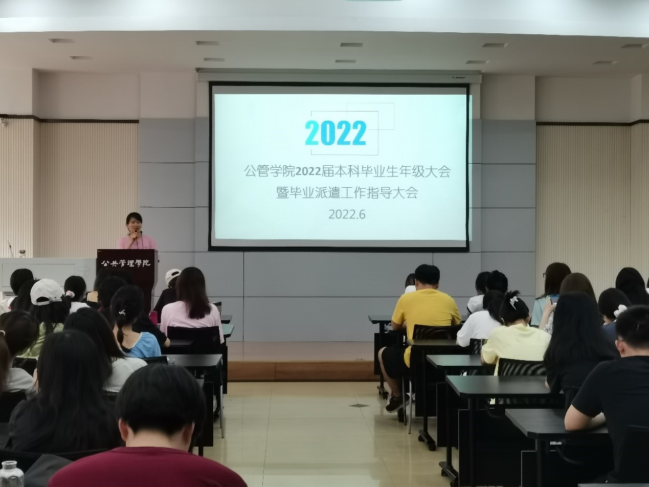 时维六月,2022届本科毕业生的相关毕业工作已经接近尾声,毕业生们也即将离开校园。为了总结前期工作,向学生们传达后续毕业工作安排,并指导学生们高效完成毕业派遣,学院于2022年6月10日在学院102会议室召开公管学院2022届本科毕业生年级大会暨毕业派遣工作指导大会。会议由2018级辅导员、公管学院团委书记徐柳老师主持召开,全体2022届本科毕业生到会参加。