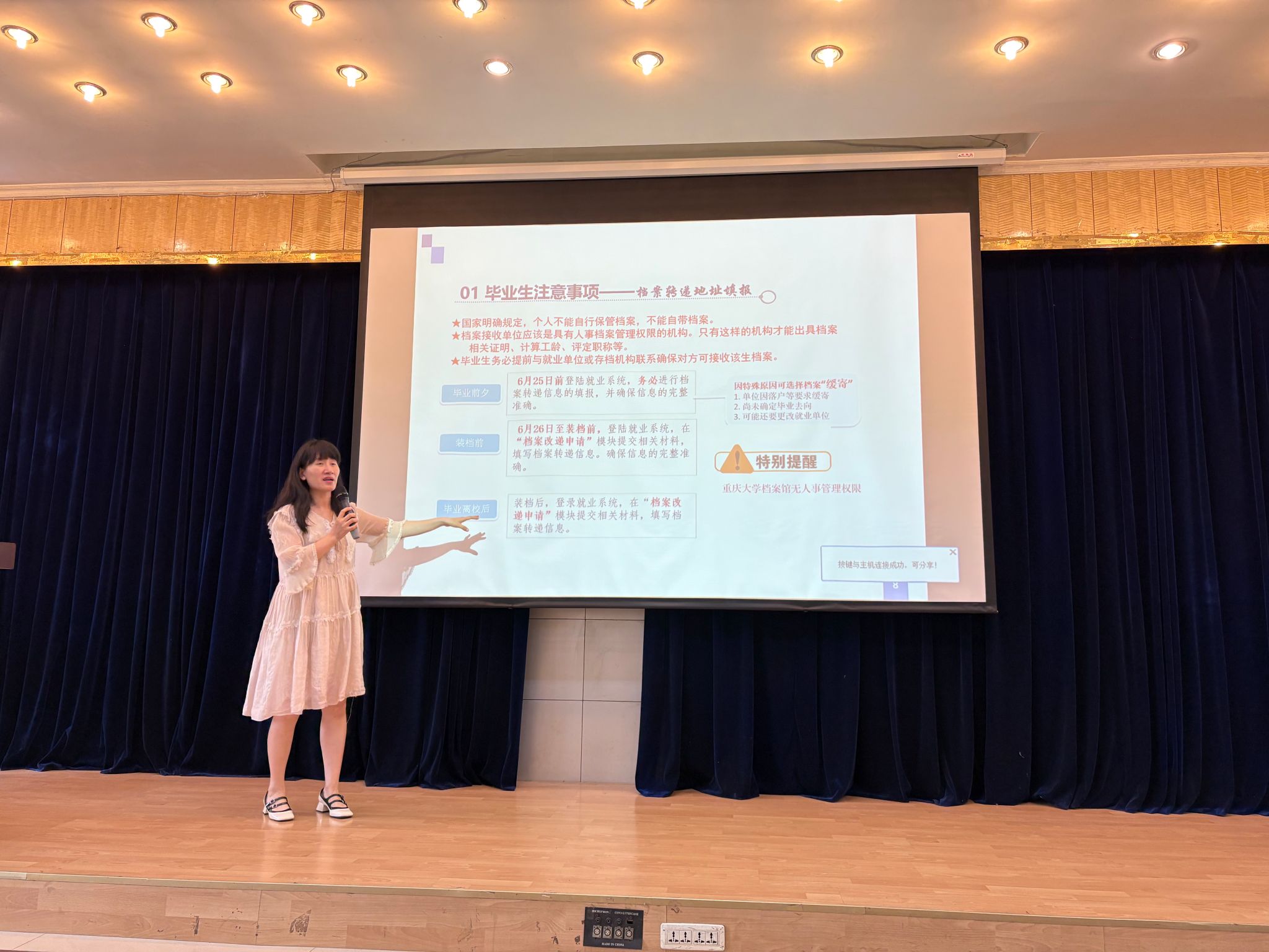 此外,徐柳老师依次介绍了学校集体户的户口迁移流程、党团组织关系转移流程与毕业典礼、双证领取等毕业相关重要事宜,梳理了材料填写清单与重要时间节点。