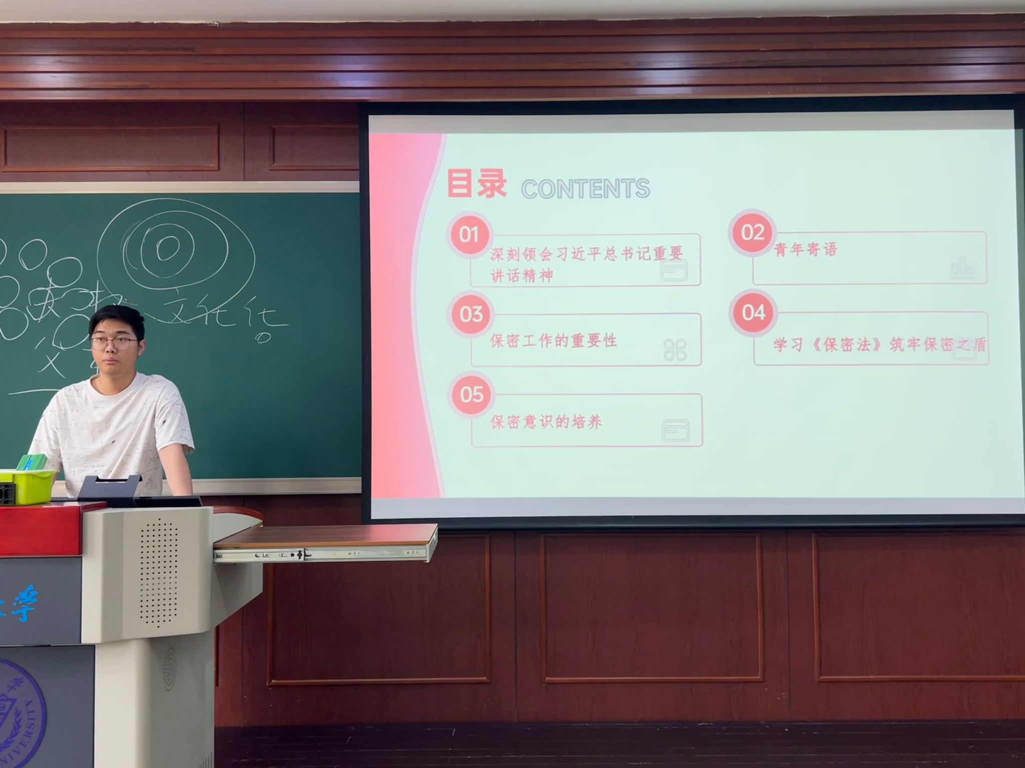 紧接着,团支书围绕“密盾护航青春路,嘉木成林向未来”这一主题,从理论层面到实践层面进行了全面而深刻的讲解。他指出,作为新时代的青年学子,我们要深刻理解保密工作的重要性,认识到保密不仅是法律法规的刚性要求,更是维护国家利益、守护科技成果、筑牢信息防线的青春担当。在此基础上,我们应该积极投身到改革实践中去,用自己的实际行动践行青春誓言。