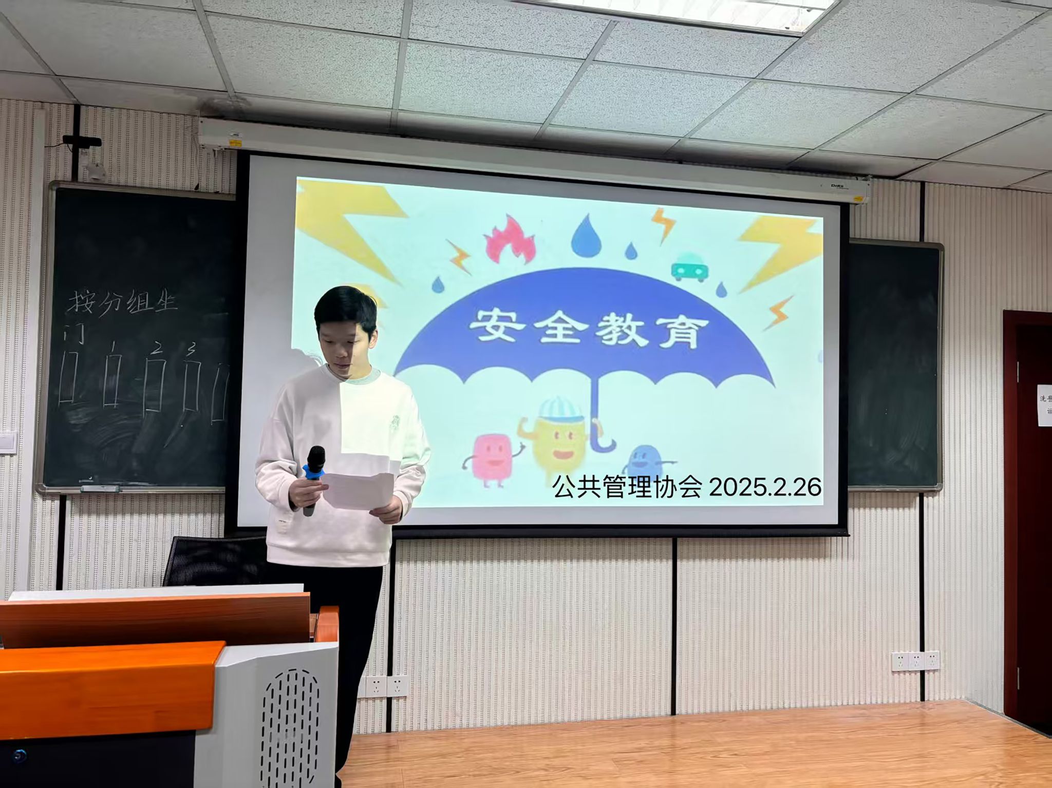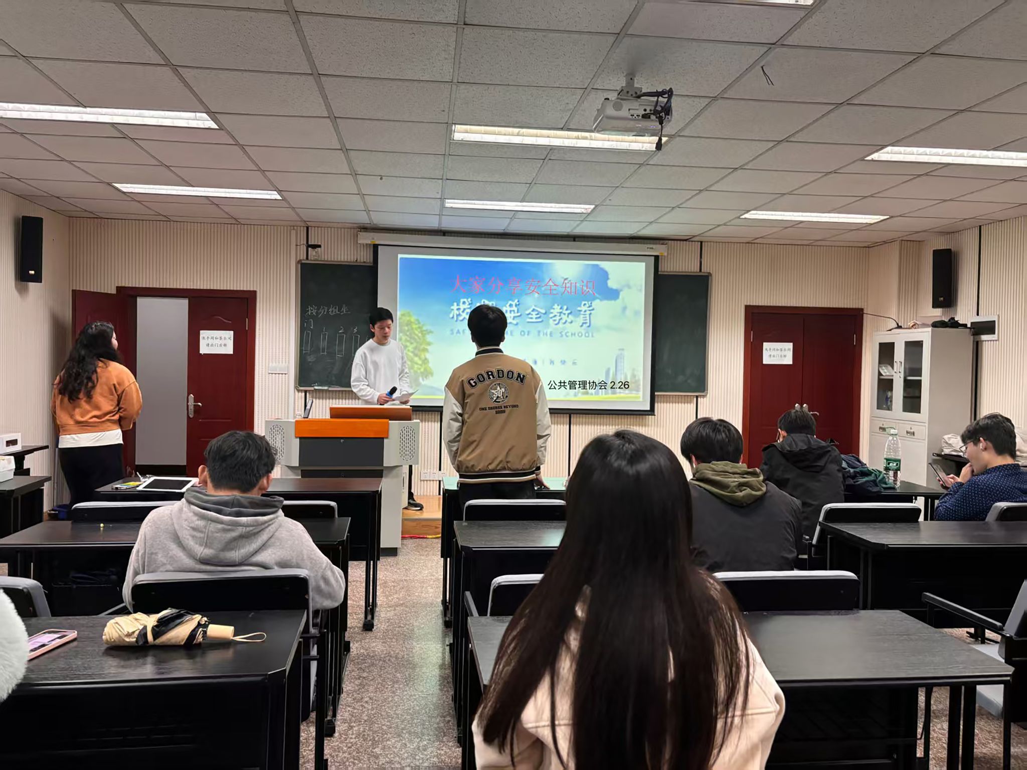2025年2月26日15:00,由公共管理协会举办的安全知识分享活动在公管大楼102成功举行。本次活动聚焦安全知识普及,特别是校园安全知识,旨在提升同学们的安全意识,营造安全和谐的校园环境。