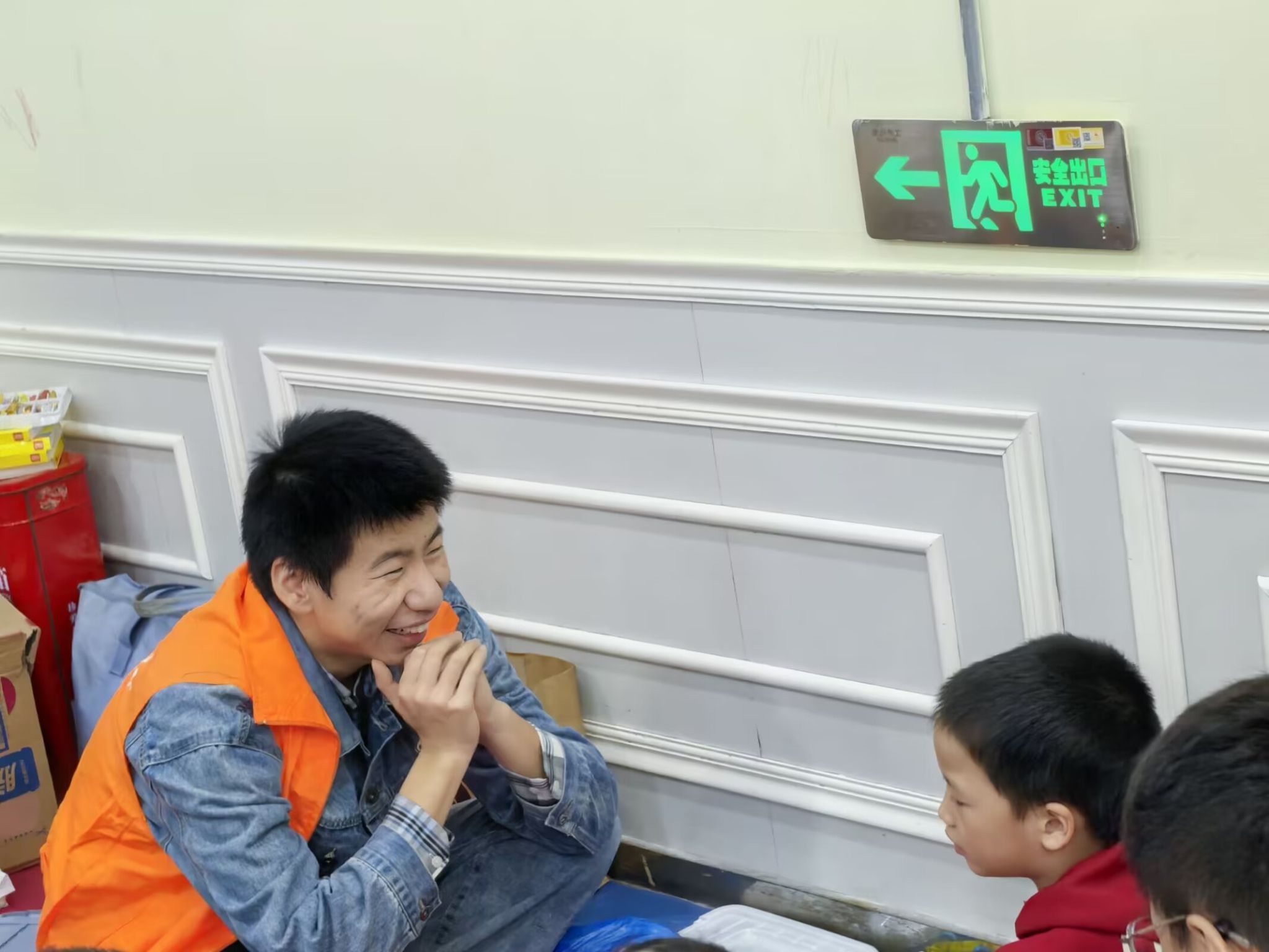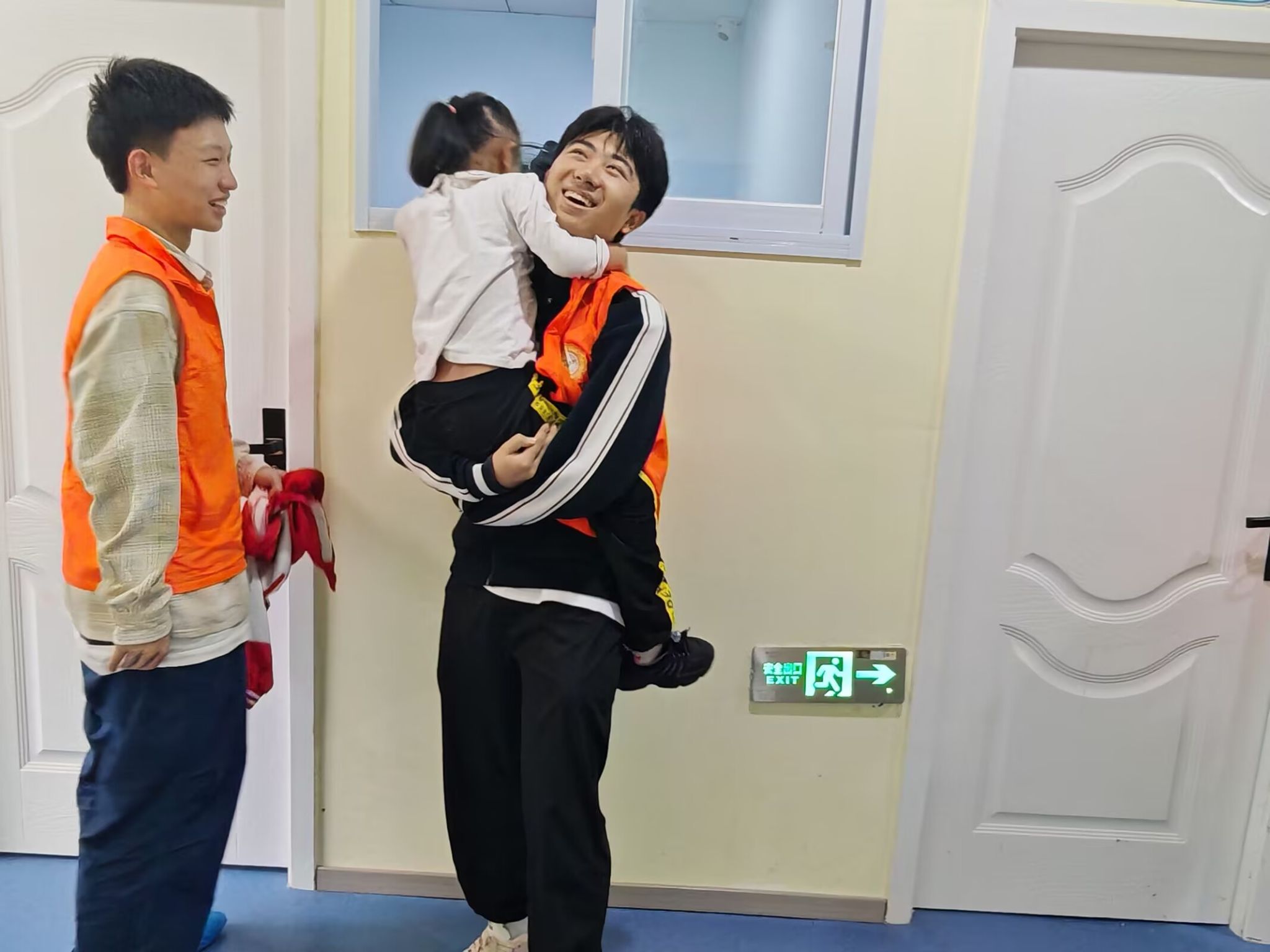 整个过程中也有一些有趣的事情。看到有的小朋友玩累了,志愿者就像对待自己的弟弟妹妹一样,耐心地背着他们,让小朋友靠在背上好好休息。