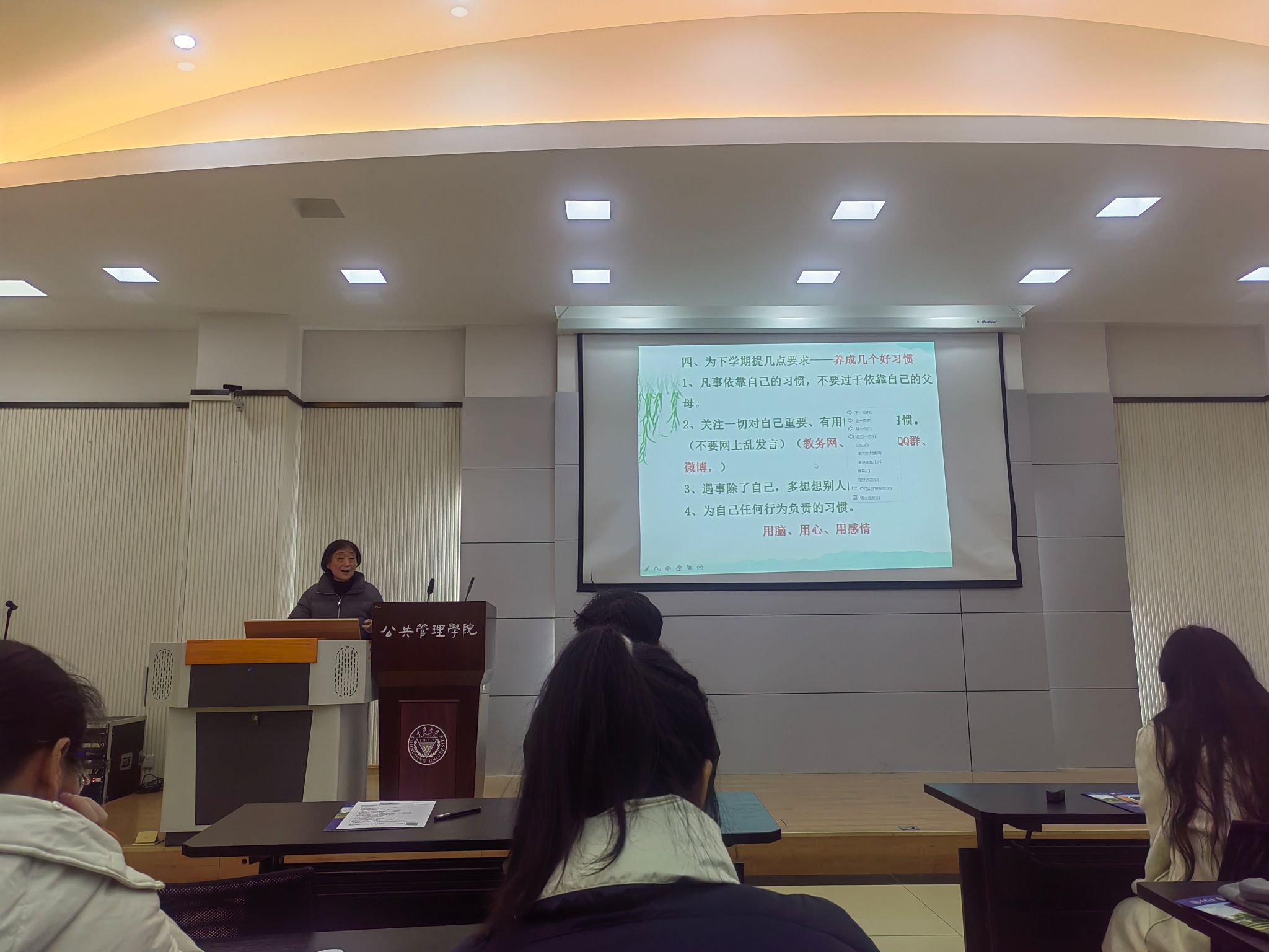 会议的最后一个部分是对下个学期的展望。在本环节中,对于迈入大三的同学们,王老师提出了几点要求,希望同学们可以保持以下几个好习惯:首先是凡是要靠自己,不要过度依赖父母;此外,要关注一切对自己重要的信息;也要学会对自己的行为负责,尤其是网络发言,要注意责任和义务。