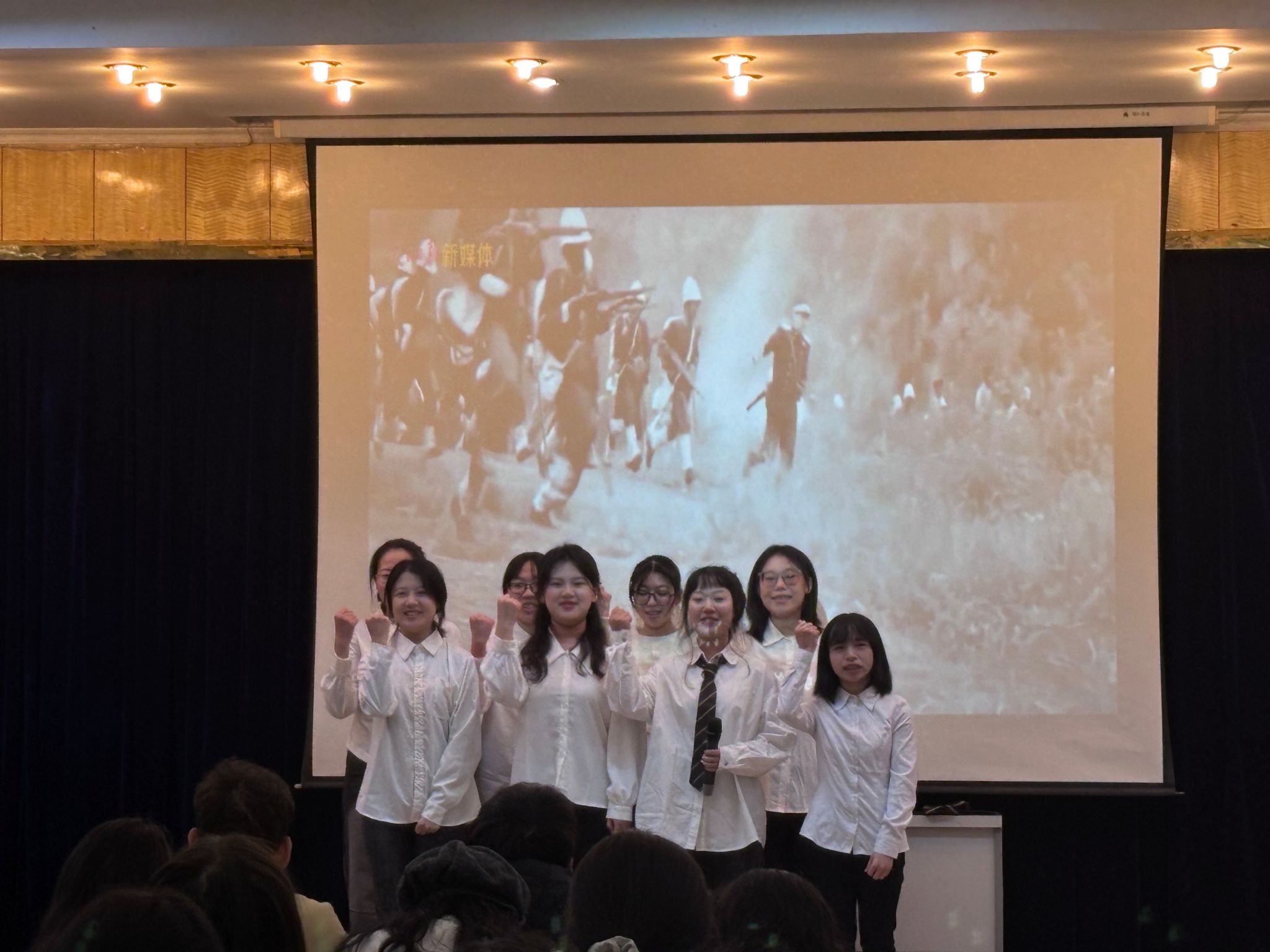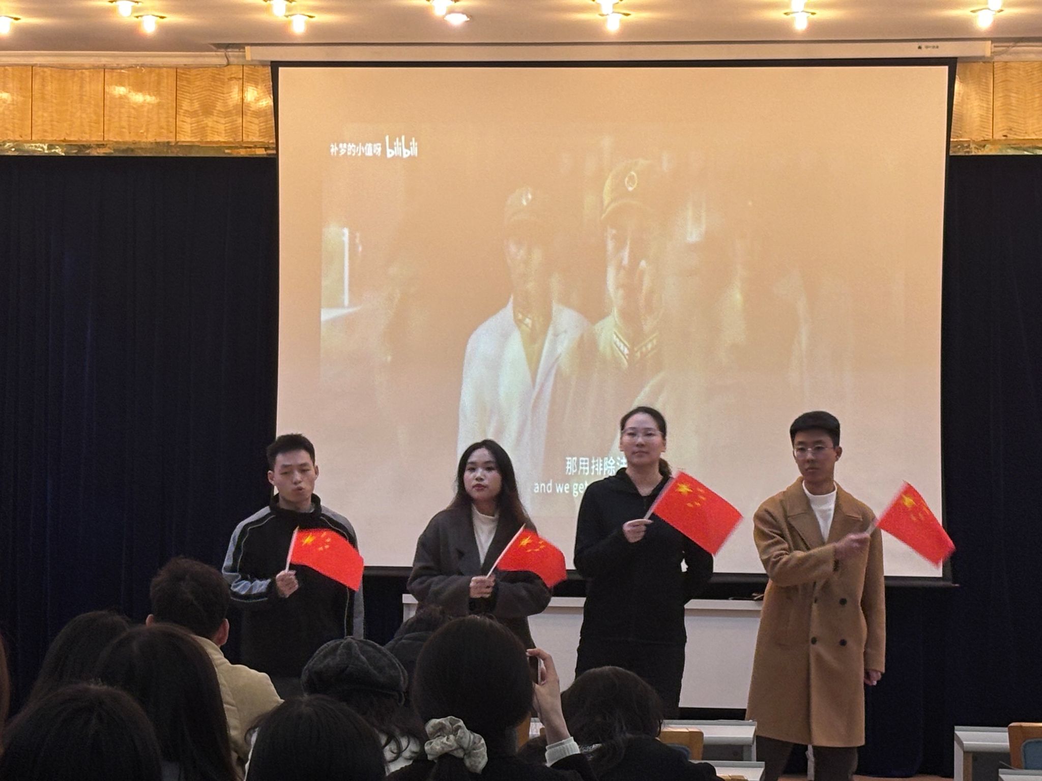 其次是“厚植爱国情怀,砥砺强国之志”爱国视频环节,主持人为大家播放一段以“红色记忆”为主题的军队离退休干部口述历史专题纪录片。影片从他们的主观视角出发,深情讲述了老一辈革命军人浴血奋战、保家卫国的感人故事,使同学们更真切地体会到先辈们忠于使命、无私奉献的崇高精神。