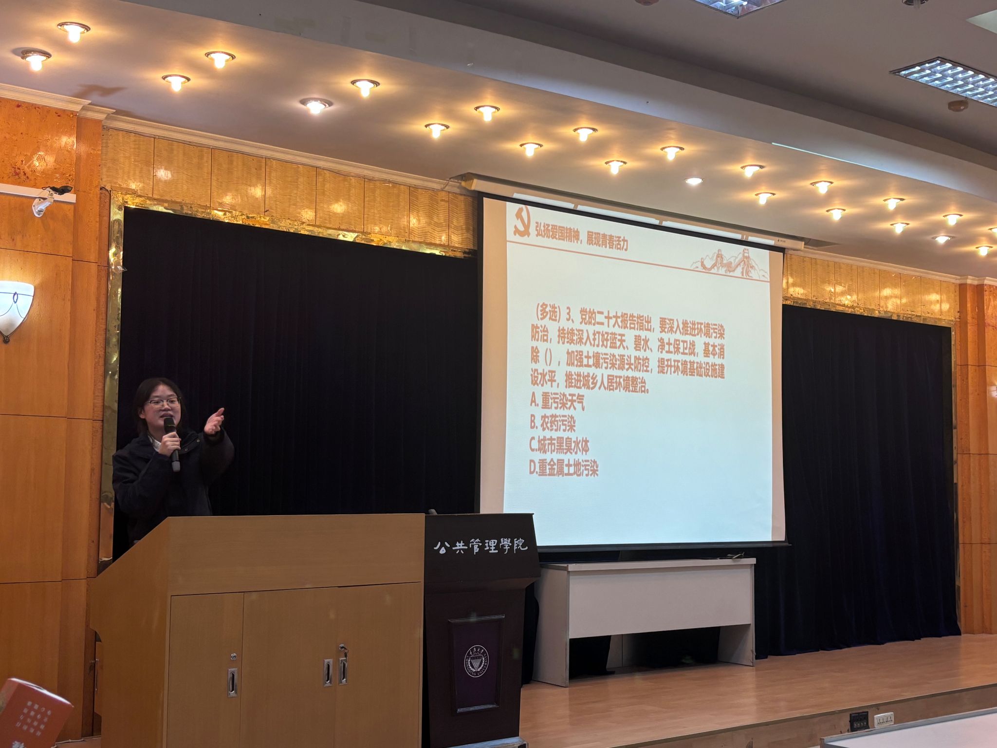 现场活动的最后是“弘扬爱国精神,展现青春活力”党史竞赛环节。竞赛以抢答方式进行,试题内容涵盖了中国共产党奋斗历程的多阶段史实。同学们认真参与,积极抢答,凭借对党史的深入了解,展现出了亮眼的竞赛表现,现场气氛十分热烈。
