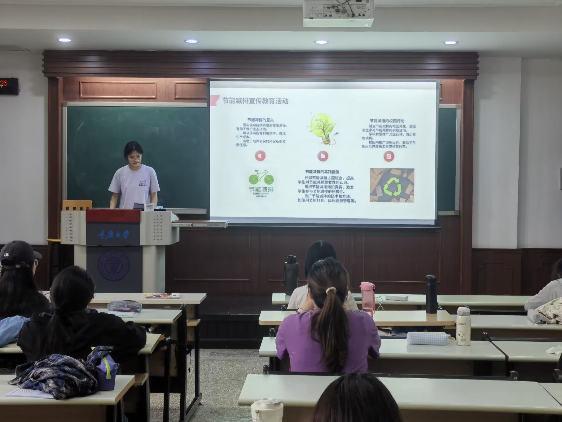 紧接着,团支书姜熠为大家深入剖析了“习近平生态文明思想”的核心要义。其主要内容为:要求各级政府加强生态保护和环境治理提高环境质量。要求企业提高环保意识,实施清洁生产,减少排污排放。要求公民提高环保意识,积极参与环保活动,形成绿色生活方式。同学们在聆听后深受启发,纷纷表示要积极参与环保活动,用更绿色健康的方式度过校园时光。