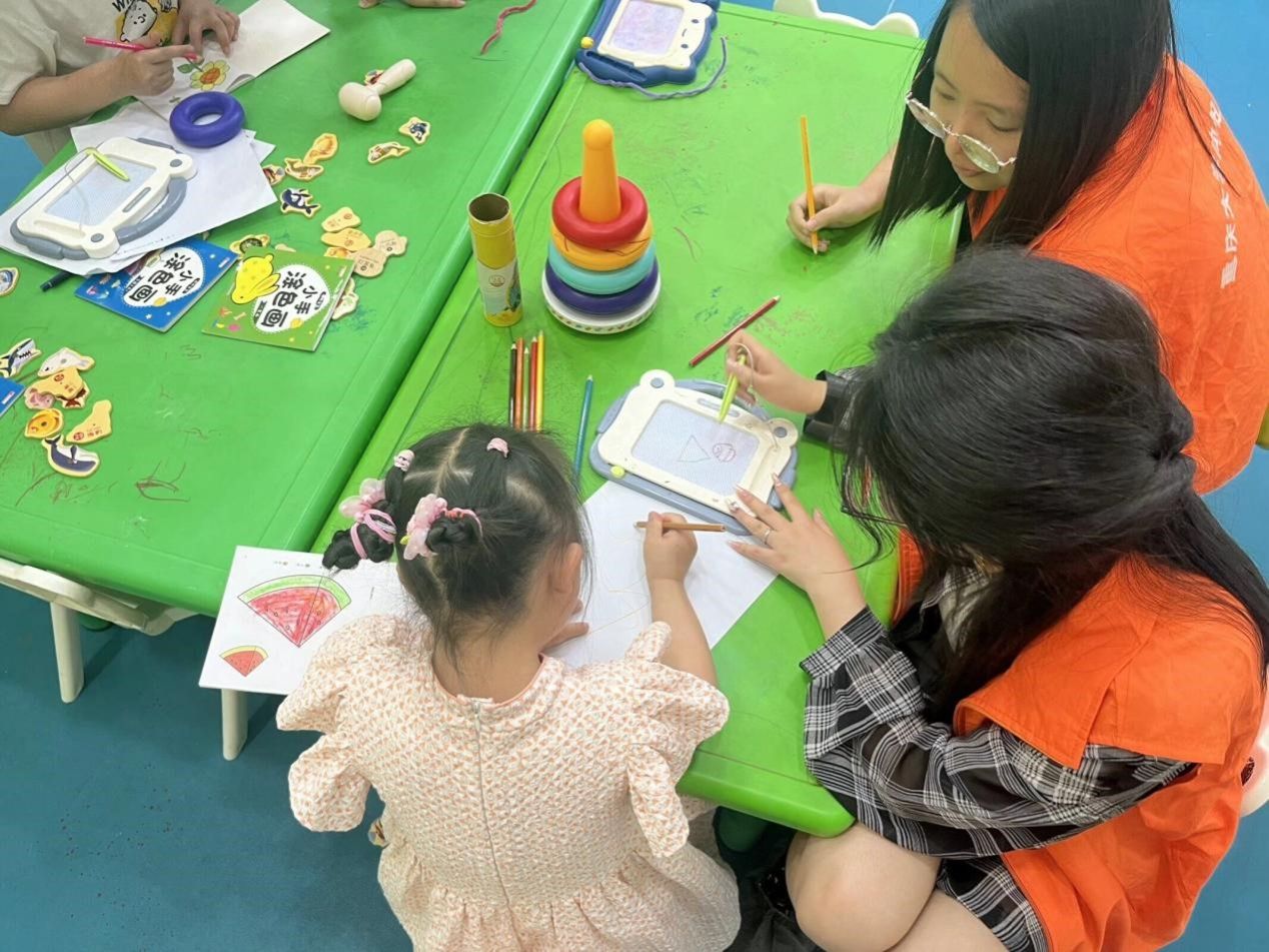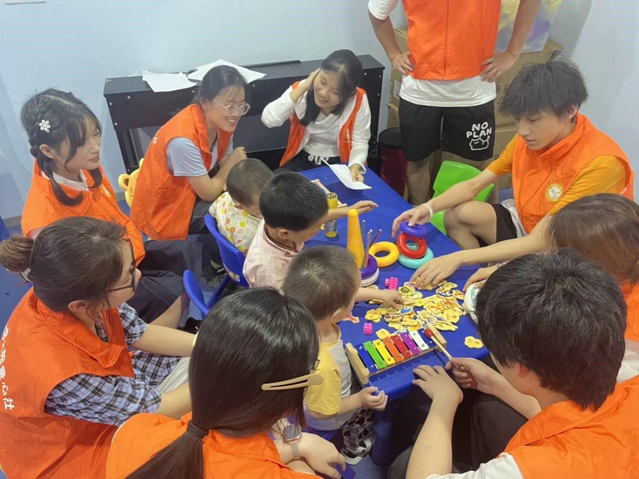 志愿者和孩子们在相处过程中表现了暖心有爱的场面。在志愿者陪伴孩子的过程中,很多孩子不知道玩具该怎么玩,志愿者们耐心给他们演示,这也让志愿者一起体会到了在小玩具中蕴藏的童心的快乐。也有志愿者用纸折出好看的纸花给小朋友们,还有志愿者教小朋友们一起唱歌,一起演奏小乐器。在小朋友们唱歌演奏或者投篮成功时,志愿者们也为他们送去了响亮的掌声。