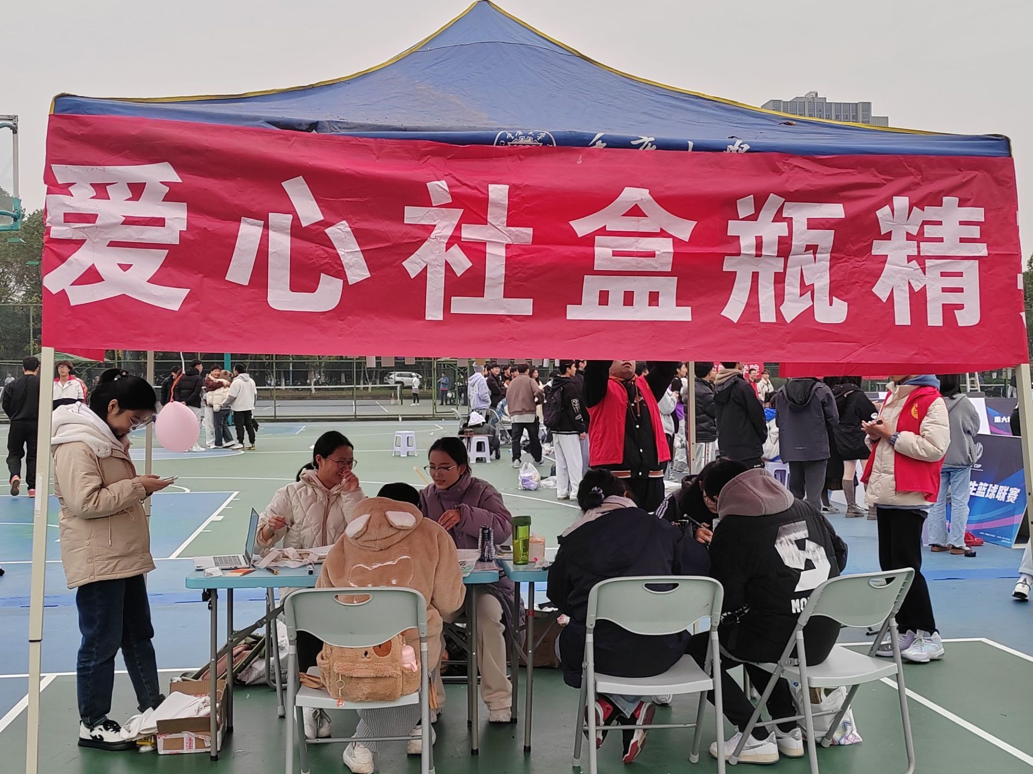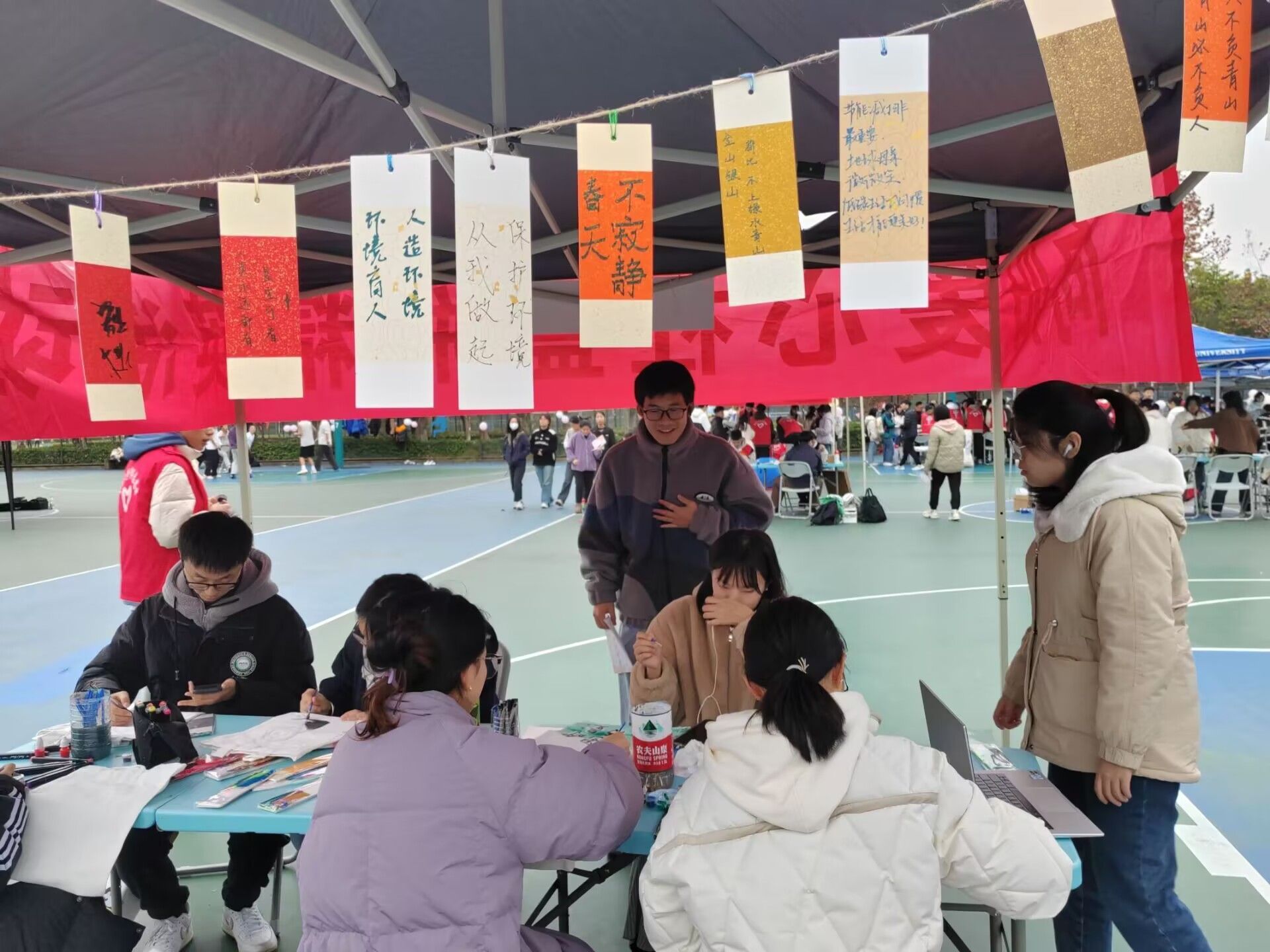 活动过程中,盒瓶精英活动的大棚前门庭若市,大量同学排队捐赠,他们都为这次活动积攒了许多纸箱、塑料瓶。除此之外,还有许多志愿者为保护环境发出呼吁,在风中摇曳的书签上写有他们真挚的愿望。