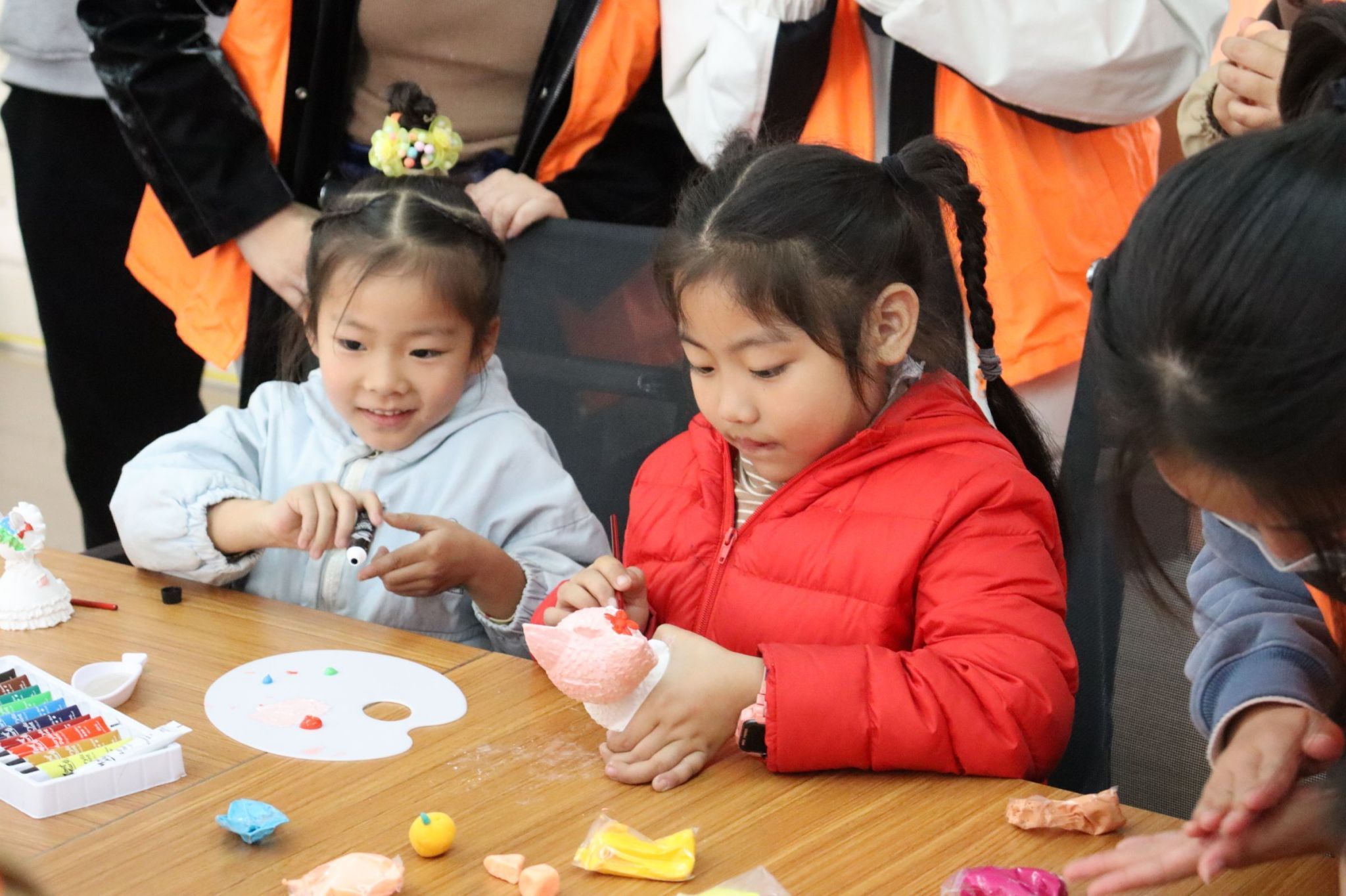 在内容的创新方面,策划组成员们置购了石膏娃娃令志愿者们陪同孩童们一同涂色。其中志愿者与孩童相处融洽,一同协商探讨石膏娃娃的不同区域的颜色选择。此活动既可以给孩童和志愿者们带来前所未有的娱乐体验,又可以在填涂的过程中培养孩童的审美能力和沟通协作能力。