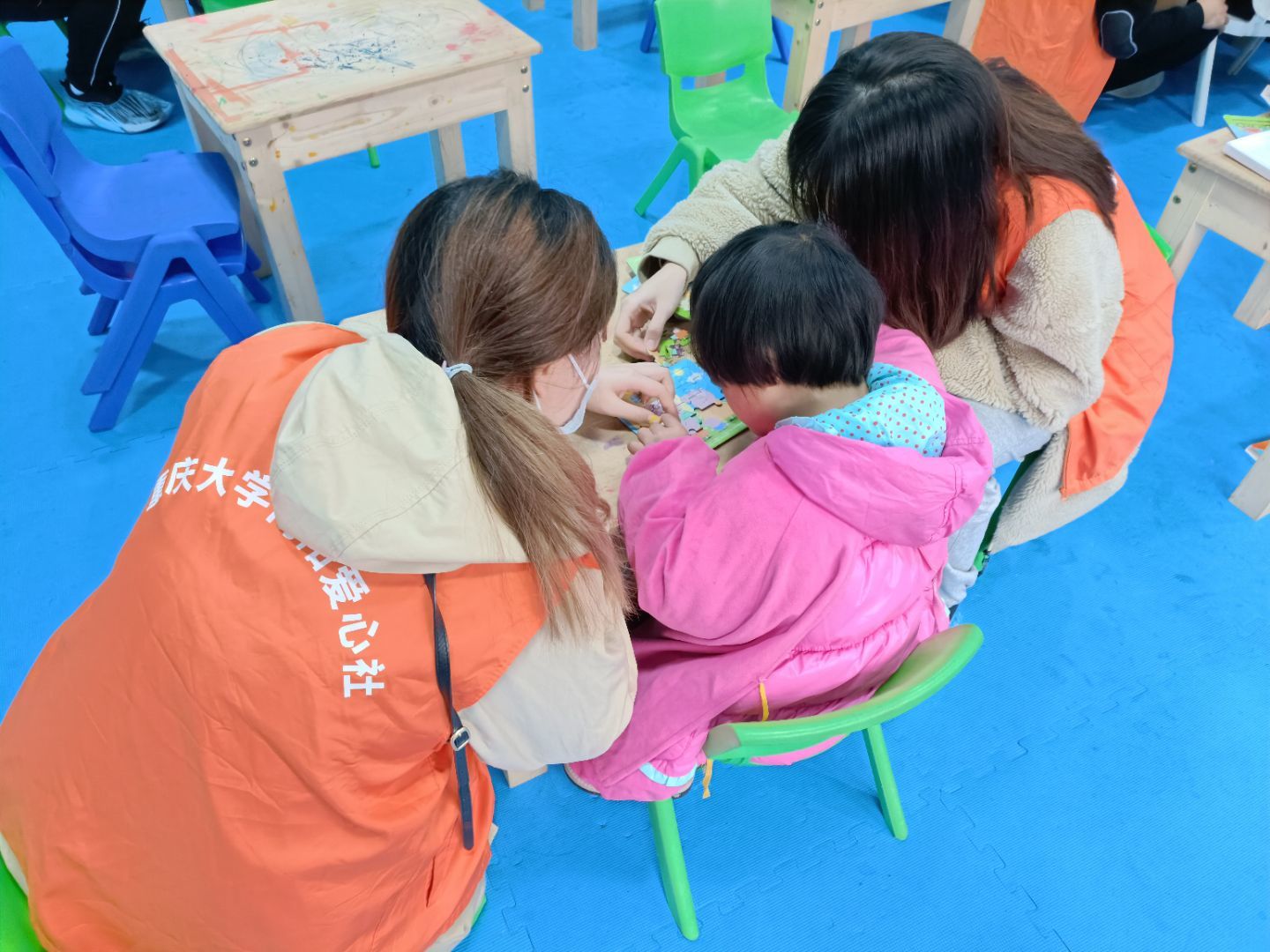 下午2点,志愿者们开始了今天的陪伴时间。志愿者刚走进璧山区启智儿童康复中心,孩子们还没下课,家长们看着一群小橙人来了,眼里充满了希望之期待。刚下课孩子们就冲出教室,在志愿者们中间穿梭,昂起头认真地“挑选”着自己心仪的志愿者哥哥姐姐们,脸上满是喜悦,志愿者们的心也被一张张单纯无邪的笑脸温暖了。由于志愿者是初次接触到这群来自星星的孩子们,并不知道应该如何和孩子们相处,但随着物资的发放,带队成员的指导后,志愿者们渐入佳境,悉心的陪伴着身旁那个来自星星的孩子。有的志愿者在座位上教小朋友拼拼图,画画,有的志愿者带孩子来到游戏房间滑滑梯,玩蹦床,现场充满了孩子们的欢笑声。