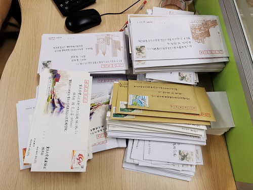 经过紧张有序的分装工作,一摞摞信件整齐地排列在了松园办公室的桌上,仿佛整装待发的精兵。一张张精美的邮票,一个个端正的字迹,即将跨越万水千山,为广大家长送去孩子们在校期间所学所获的证明。信笺一纸,其轻其薄,却承载了学生们孜孜不倦的学习精神,承载了学院管泽天下的育才之心。