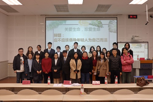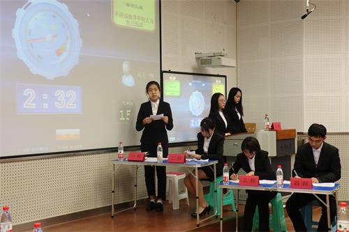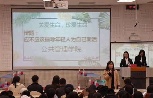 在主持人宣读完比赛规则后,双方就“应不应该倡导年轻人为自己而活”这一辩题展开激辩。在立论陈词阶段,公管三班作为正方首先对其所持观点进行了解读,由浅入深提出两个论点,一是“倡导年轻人为自己而活可以引导人保持追逐理想的初心,实现自我价值”。二是“年轻人的个性化发展有利于为社会发展注入源源不断的活力,推动社会发展”,条理清晰,铿锵有力。反方一辩从容不迫,以“倡导”一词为切入点,论点新颖,表达流畅,有理有据。难分伯仲的开局点燃了观众们的热情,博得掌声连连。