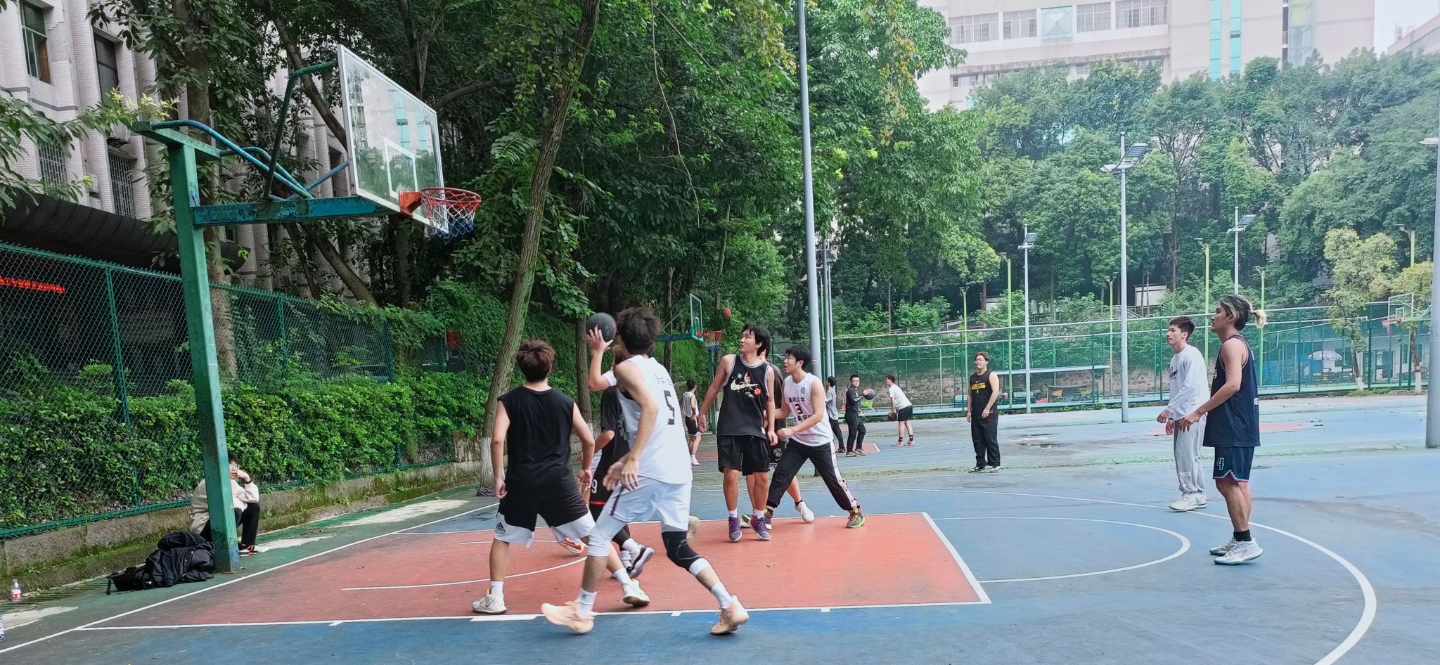 A区篮球场拉开帷幕。经济学联队与行管联队、国贸联队与城管联队分别展开对决。