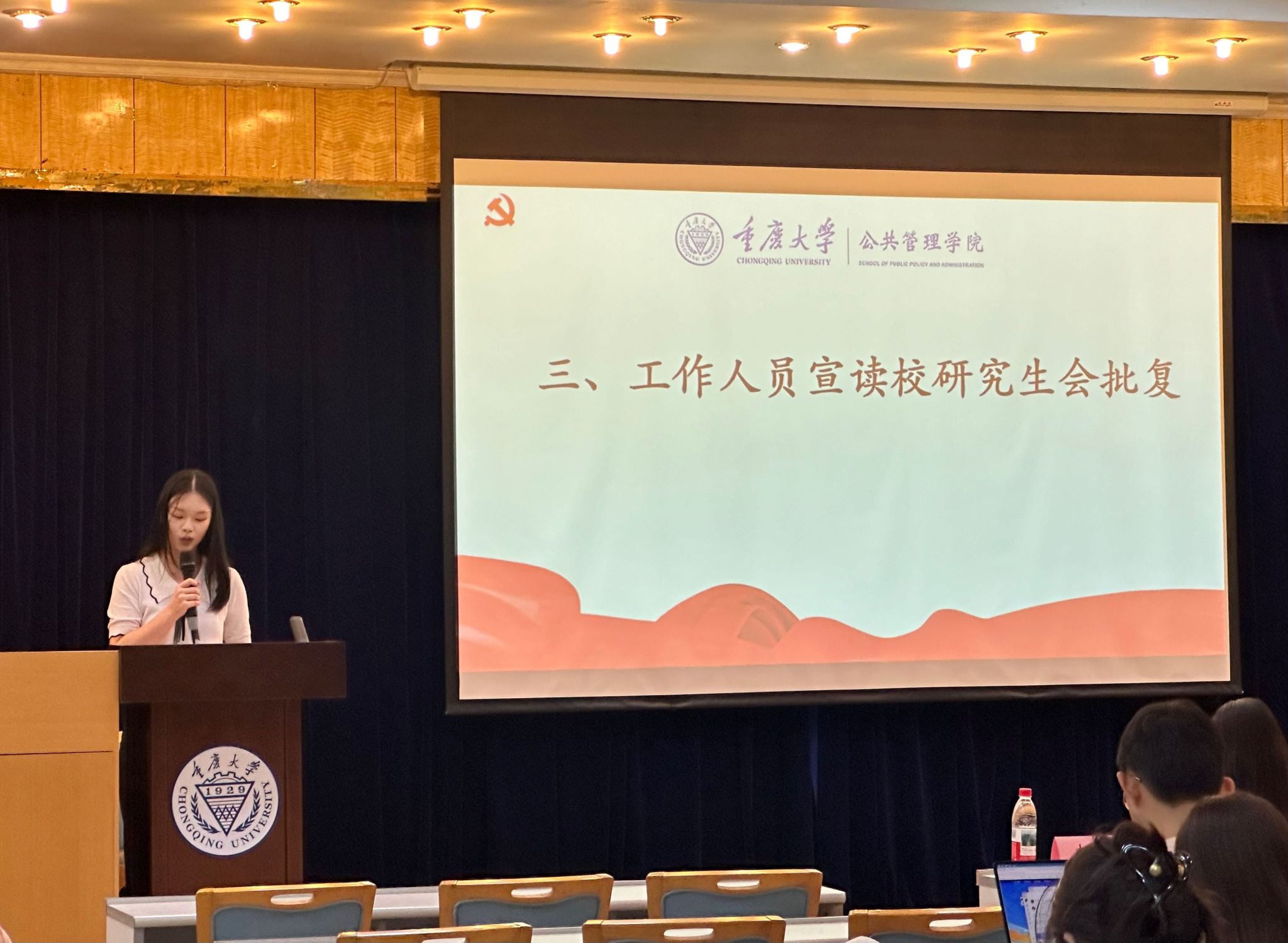 国歌奏唱完毕,大会按既定议程有序推进。校研会代表姒滟璟上台宣读校研究生会批复。