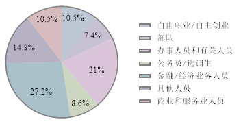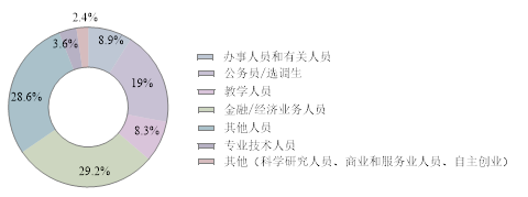 2015届硕士毕业生中选调生或公务员共32人,占就业总数的19%;金融/经济业务人员49人,占比29%,基本都在金融业,其余则单独分散在房地产业等等;办事人员和有关人员共15人,占比9%,房地产业人数较多,其余散乱分布在教育业、建筑业和金融业等等;担任教学人员共有14人,其中9人都在高等教育单位;专业技术人员为6人,3人在信息传输业,其余在建筑业和制造业;其他人员共48人,主要在公共管理社会保障组织、交通运输业、房地产业、教育、金融业、制造业等;另有3人分别为科学研究人员、商业和服务业人员,1人在制造业进行自主创业。