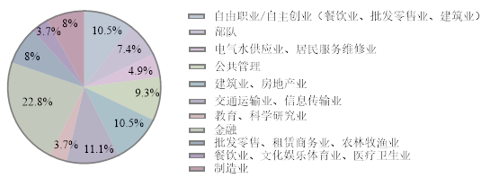 就业单位以国有企业为主体,去往国有企业共53人,占比33%,集中在建筑业、金融业,还有分布在信息传输业、制造业和交通运输业等;其次是其他企业(民营等),共54人,占比33%,主要分布在电气水供应业、房地产业、金融业和信息传输业;三资企业有8人,在制造业、餐饮业、批发零售业都有分布;机关单位有16人,为选调生、普通公务员或办事人员;其他事业单位2人,在教育业和电力行业;有自由职业/自主创业17人,部队12人。