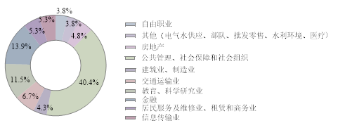 就业单位以国有企业为主体,去往国有企业共43人,占比44%,集中在建筑业、金融业,其次为交通运输业;其次是其他企业(民营等),共35人,占比36%,主要分布在房地产业和教育业,其次为批发零售业,信息传输业、制造业和租赁服务业;三资企业有4人,在房地产业、批发零售业和信息传输业;机关单位有5人,为选调生或普通公务员;其他事业单位2人,是文化体育行业教学人员和部队人员;另有自由职业和自主创业9人,主要从事写作方面工作。