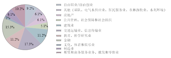 2017届本科毕业生就业职业分布不算集中,其中办事人员和有关人员占比最大,总共29人,占比30%,基本都在建筑业,其余零散分布在教育业、制造业和信息传输业;其次为金融/经济业务人员,总共23人,占比24%,基本都是在金融业,其余同样零散分布在制造业等行业中;有专业技术人员11人,主要在信息传输业,其余单个零散分布在各个行业;选调生/公务员共5人,有3人在重庆市,其余在广东省和山西省;商业和服务业人员9人,大多在批发和零售行业;有6人为教学人员,其中5人都在教育培训机构;其他人员(包括部队人员)有6人,从事交通运输业等等;另外有9人进行自主创业或者自由职业,大部分都是自由撰稿人,从事文学创作、书店等业务。