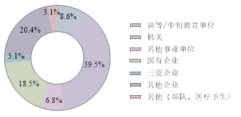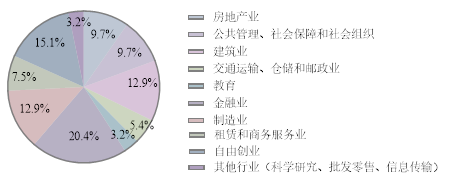 就业单位以国有企业为主体,去往国有企业共38人,占比41%,集中在建筑业、金融业和制造业;其次是其他企业(民营等),共28人,占比30%,分布在各个行业,主要是房地产业和金融业;三资企业有3人,分别在金融业和制造业;机关单位有8人,均为选调生或普通公务员;另有高等教育单位或者其他事业单位2人,及自由创业14人分布在餐饮单位和培训单位。