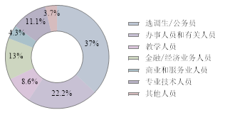 硕士毕业生以选调生或公务员居多,共60人,占就业总数的37%,其中的85%集中在重庆市;金融/经济业务人员21人,占比13%,基本都在金融业,然后分散在信息传输、交通运输等行业;专业技术人员为18人,占比11%,主要在房地产业和建筑业,零散分布在交通运输业和医疗卫生行业等;担任教学人员共有14人,相比本科生多很多,其中12人都在高等教育单位,1人在中初教育单位,剩下1人在教育培训机构;办事人员和有关人员共36人,占比22%,广泛分布于公共管理社会保障组织、房地产业和制造业;另有7人从事商业和服务业人员,零散分布在房地产业和交通运输业;其他人员共5人,行业各不相同;另有进入部队1人。