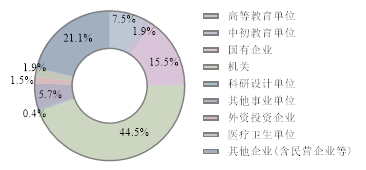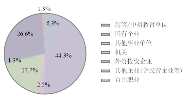 硕士生就业单位相比本科生更为集中,近一半在政府机关单位,共118人,占比45%;进入其他事业单位的共15人,占比6%,大多都是在公共管理、社会保障和社会组织中;其次为民营企业等其他企业,共56人,占比21%;国有企业共41人,占比16%,在企业中基本都是从事办事人员或金融人员工作;硕士生进入高校的机会增加,进入高等教育单位20人,进入中初教育单位5人,总共占比9%;其余则为医疗卫生单位(5人)、外贸投资企业(4人)、科研设计单位(1人)。