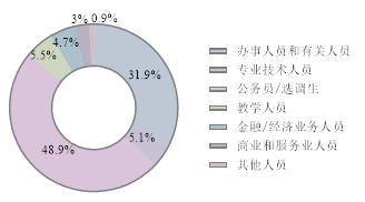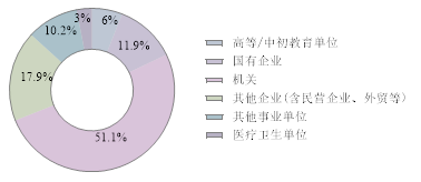 硕士毕业生一半都在政府机关单位,共120人,占比51%;进入其他事业单位的共24人,占比18%,都是在公共管理、社会保障和社会组织中;其次为民营企业等其他企业,共56人,占比21%;国有企业共28人,占比12%,大多是金融业和建筑业,从事办事人员或金融人员工作;进入高等教育单位12人,中初教育单位2人,总共占比6%;其他企业(含民营企业等)为40人,主要在信息传输业和商务服务业;其余则为医疗卫生单位(7人)和外贸投资企业(2人)。