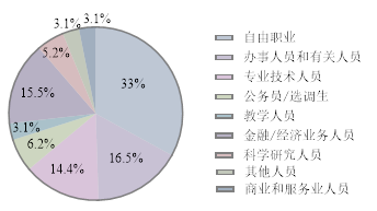 本科毕业生就业职业呈现多元态势,占比最多的是自由职业人员,占比33%,从事着自媒体、文员、培训师、家教、网文作者等等职业;办事人员和有关人员为16人,占比17%,均匀分布在建筑业、科学研究业、信息传输业和商务服务业;金融/经济业务人员15人,占比15%,主要是在金融业,其次为制造业;专业技术人员为14人,基本分布在建筑业和制造业;2021届本科生只有6人从事选调生/公务员;另有教育培训行业的教学人员3人,商业和服务业人员及其他人员6人,单独分布在社会组织、农牧业、住宿餐饮业、建筑业、居民服务业和技术服务业。