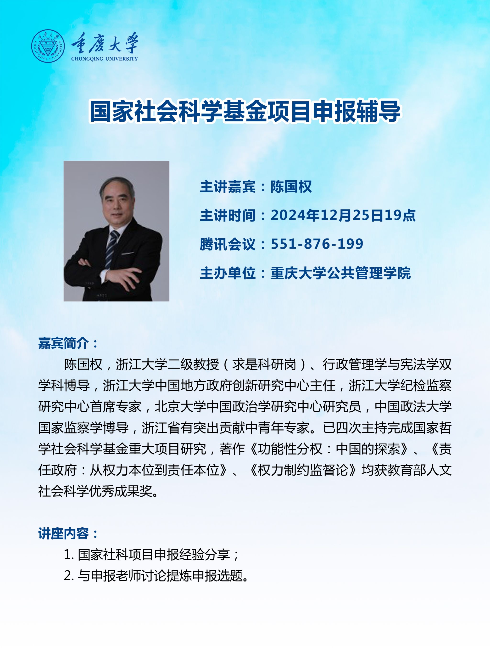 2024年12月25日晚,浙江大学二级教授、北京大学中国政治学研究中心研究员、中国政法大学国家监察学博导、浙江省有突出贡献中青年专家、国家哲学社会科学基金重大项目负责人陈国权教授受邀于成人影片 通过线上会议的形式进行国家社会科学基金项目申报辅导的学术讲座,同成人影片 教师进行分享。学术讲座由学院副院长王辉主持。陈国权首先进行了国家社科项目申报的经验分享,分别从研究问题的选择、学术史的编写、研究方法与技术路...