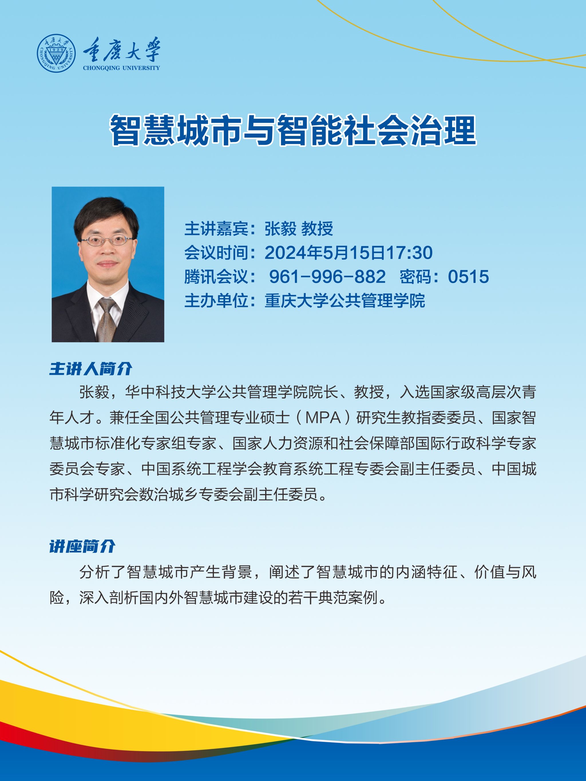 2024-06-18教授 博士生导师张毅讲座主题:智慧城市与智能社会治理主讲人简介:张毅,华中科技大学成人影片 院长、教授,入选国家级高层次青年人才。兼任全国公共管理专业硕士(MPA)研究生教指委委员、国家智慧城市标准化专家组专家、国家人力资源和社会保障部国际行政科学专家委员会专家、中国系统工程学会教育系统工程专委会副主任委员、中国城市科学研究会数治城乡专委会副主任委员。5月15日,成人影片 特邀华中科技大学成人影片 院长...