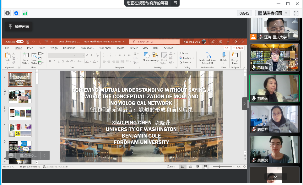 2022-03-08为了进一步开阔师生的视野,发掘学术兴趣,启发科研思路,2022年3月4日上午10点,成人影片 举办了以《彼此理解勿需语言:默契形成的前因后果》为主题、以腾讯会议为依托的线上讲座。本次讲座的主讲人是美国伊利诺大学工业和组织心理学博士、美国管理学会院士、美国心理学会院士陈晓萍教授。讲座由成人影片 副院长刘渝琳教授主持。陈晓萍潜心于教学研究,曾任美国华盛顿大学福斯特商学院副院长和组织管理学主任,...