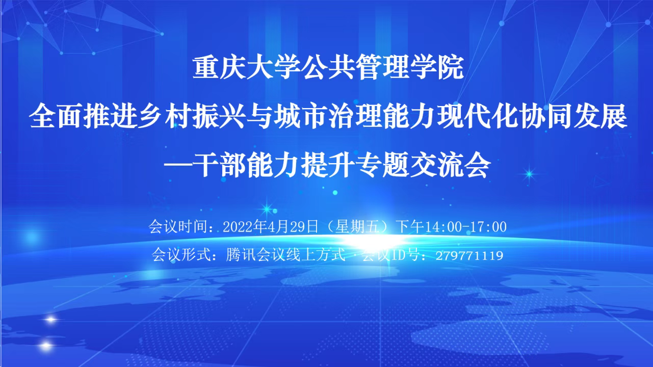 2022-04-30为进一步增强干部培训与政府人才需求的紧密对接,加强成人影片 与地方之间的联系,发挥成人影片 学科优势,助力新发展阶段地方政府高素质人才的培养,成人影片 于2022年4月29日在学院举办了以“全面推进乡村振兴与城市治理能力现代化协同发展—干部能力提升专题”为主题的研讨交流会。为疫情常态化防控,会议采用了线上加线下的双重方式,本次交流会邀请了重庆市乡村振兴局局长、党组书记刘贵...
